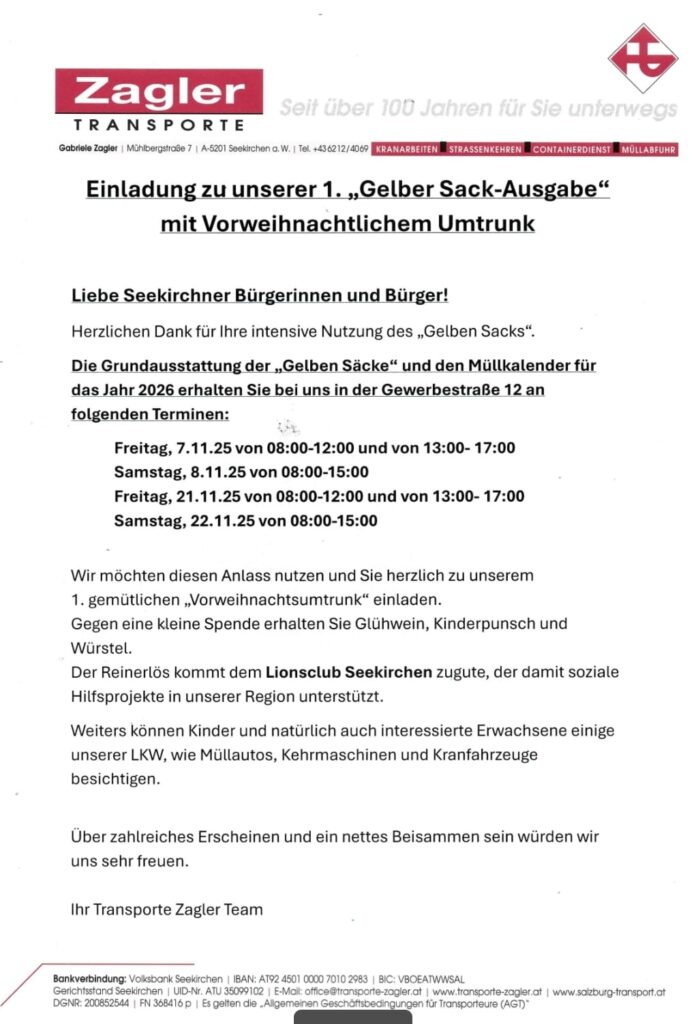 Wichtige Information zur „Gelben Sack“ Abholung für ALLE Seekirchnerinnen und Seekirchner